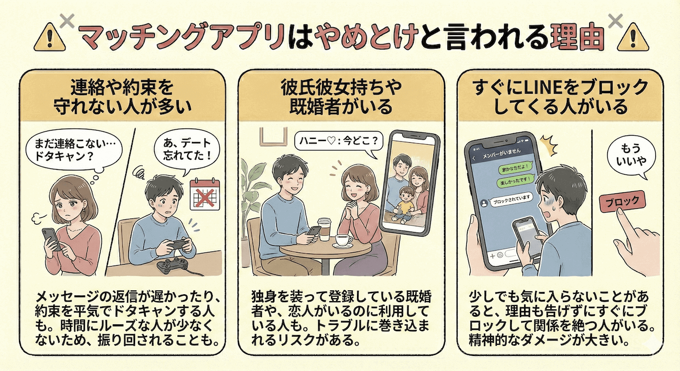 これも「マッチングアプリはやめとけ」と言われる理由の一つです。