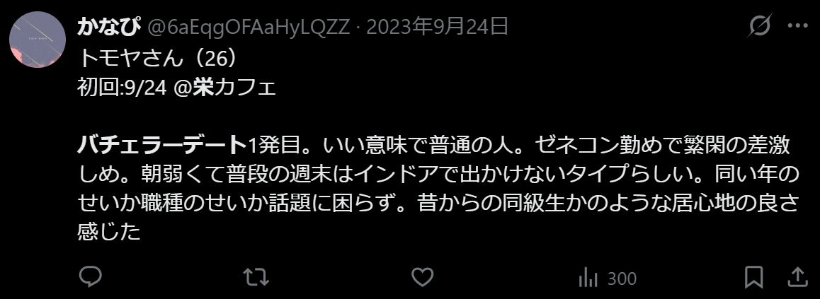 無駄にメッセージする必要がないので、効率が良いです。名古屋でも綺麗な人が多いと思いました。