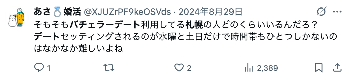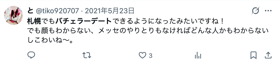 札幌は「職場・サークル・友達経由の出会いが狭くなりやすい」街であり、実際にSNSを見ても札幌でバチェラーデートを使ったことがある人の声が多数発見できます。