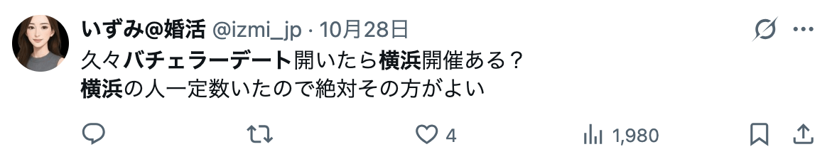 その証拠に、SNSを見ても横浜からバチェラーデートを利用している方の投稿を確認することができます。
