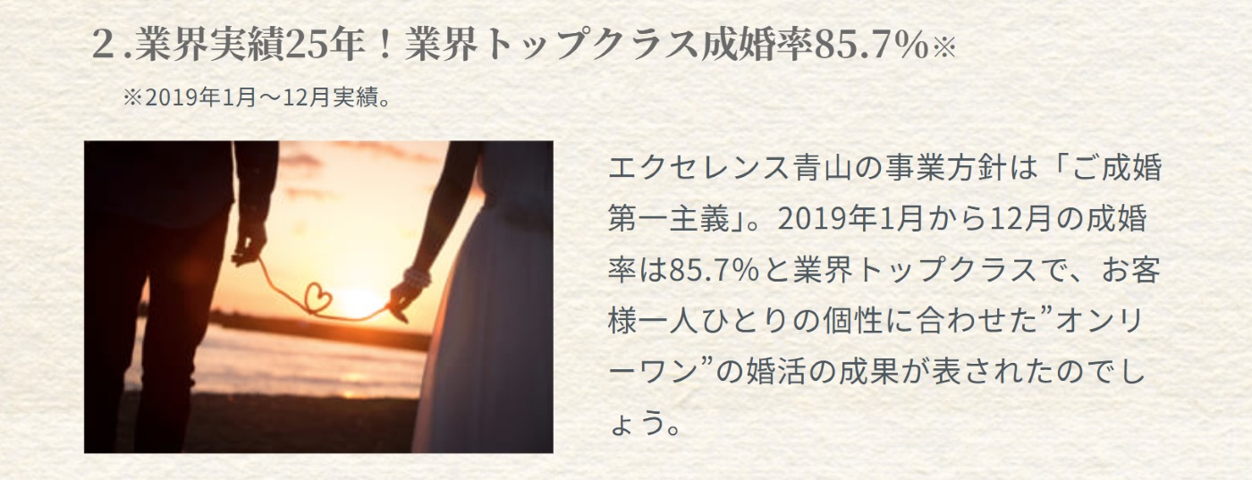 結婚相談所の成婚率の平均が20~30%ほどと言われているなかで、エクセレンス青山の成婚率は85.7%と驚異的な高さを誇っています。