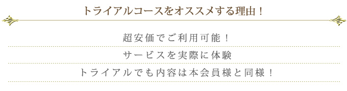 エクセレンス青山は、いきなり高額な入会ではなく、11,000円(税込)のトライアルコースでお試し利用ができる点も好評です。