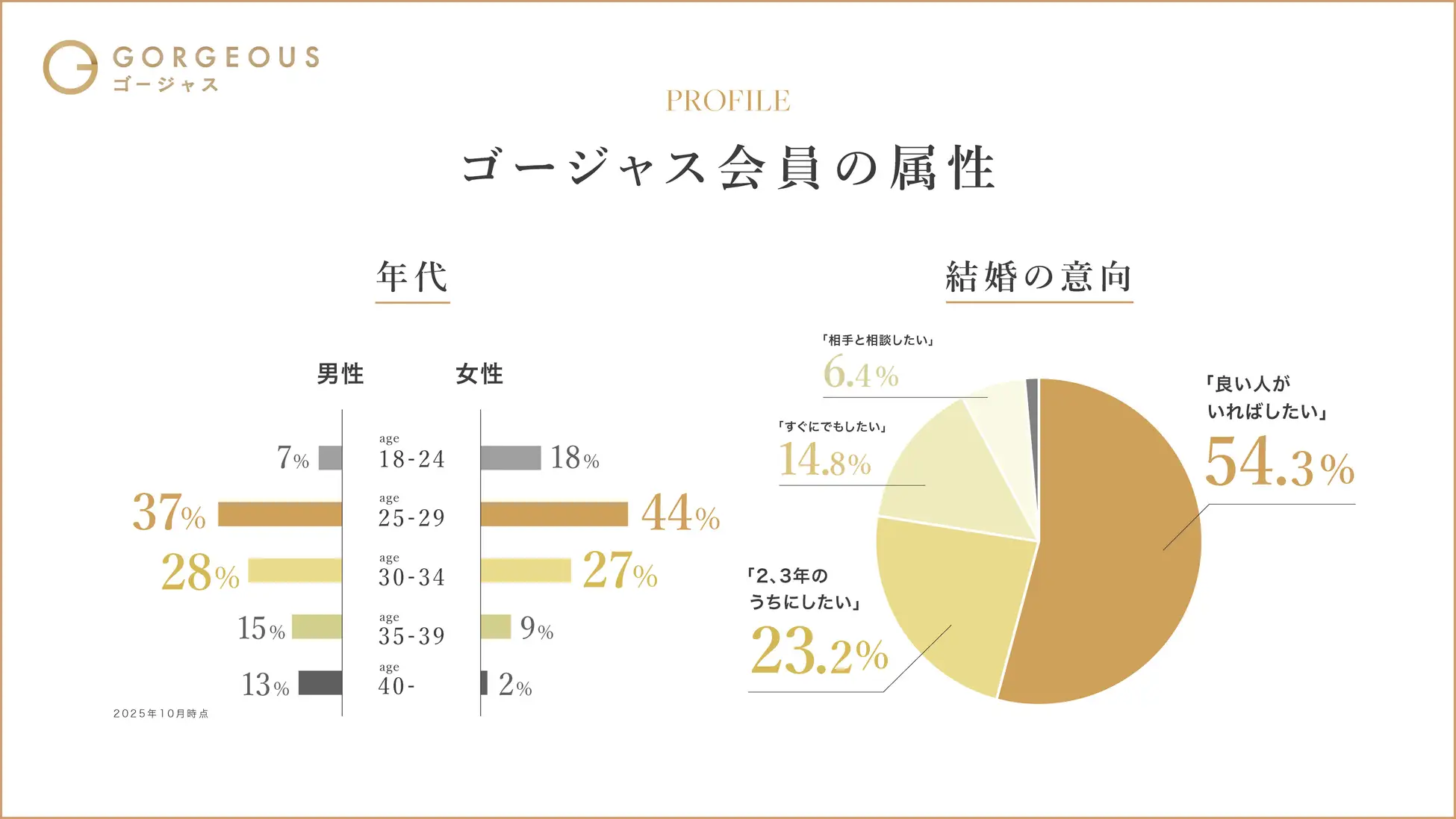 また、会員の54.3%は結婚の意向として「良い人がいればしたい」と回答していることからも分かるように、結婚欲が高い人が多いのもゴージャスの特徴です。