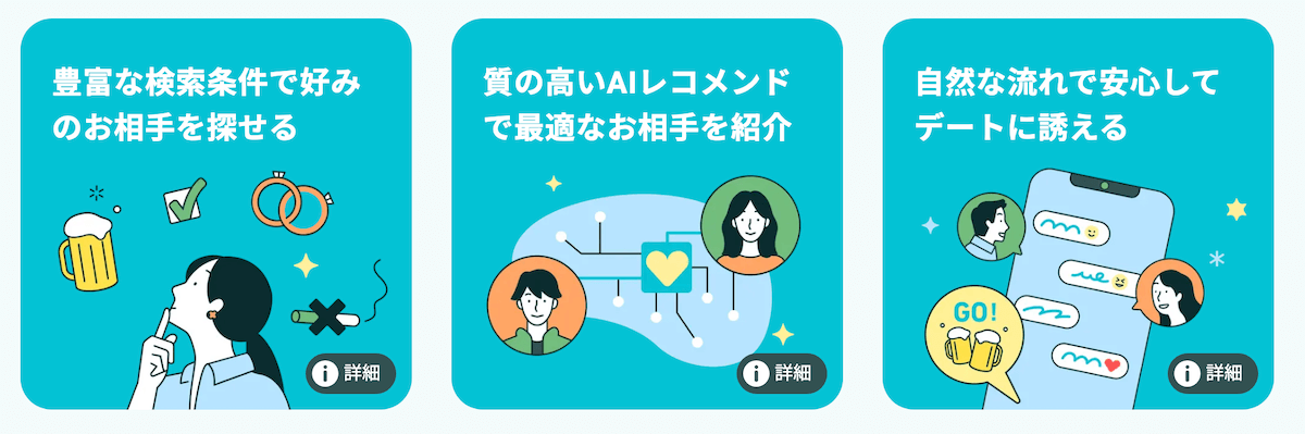 マッチングからデート場所選定、日程調整まですべて自動で行ってくれるので、忙しい人でもスムーズに初回デートまで進むことができます(めっちゃ便利です)