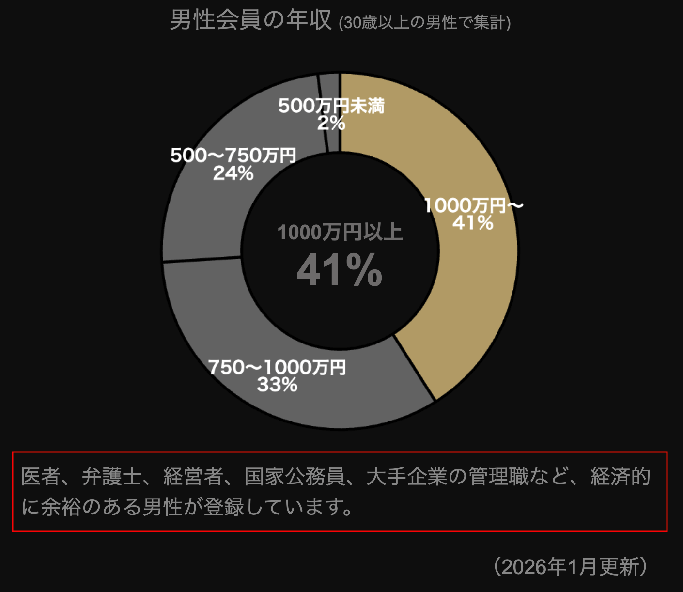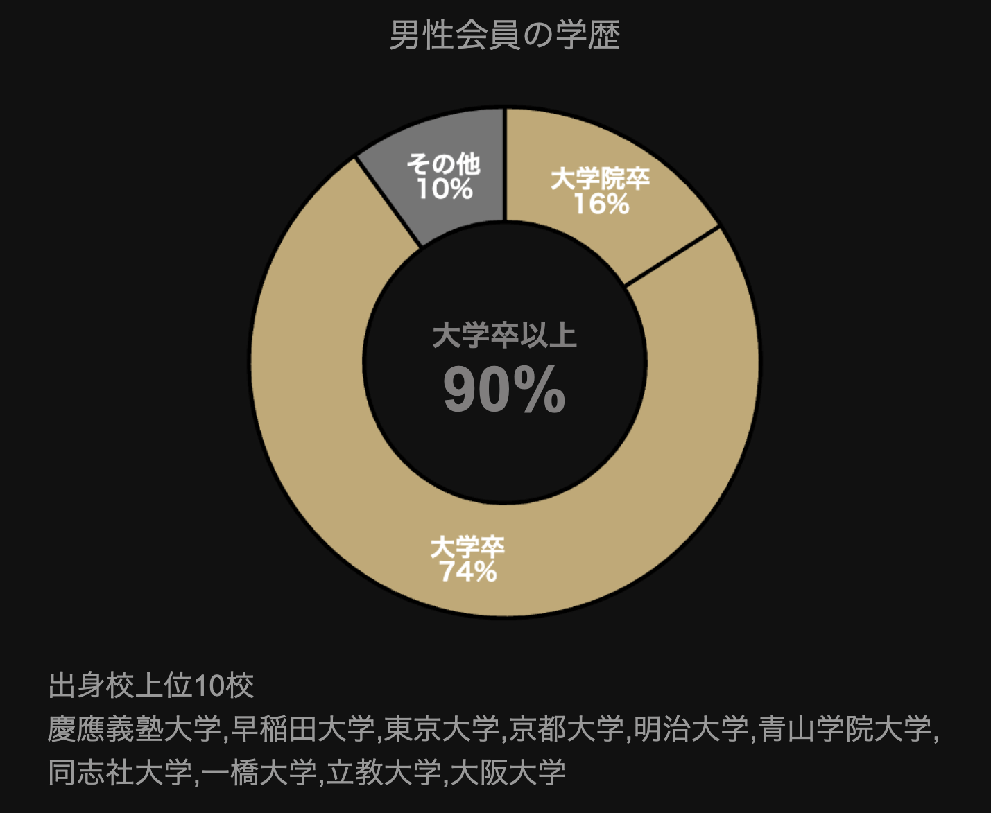 完全審査制のため、一定の年収や職業などスペックが高い男性ばかりであり、医師・外資系・大手企業勤務・経営者などが多く見られます。